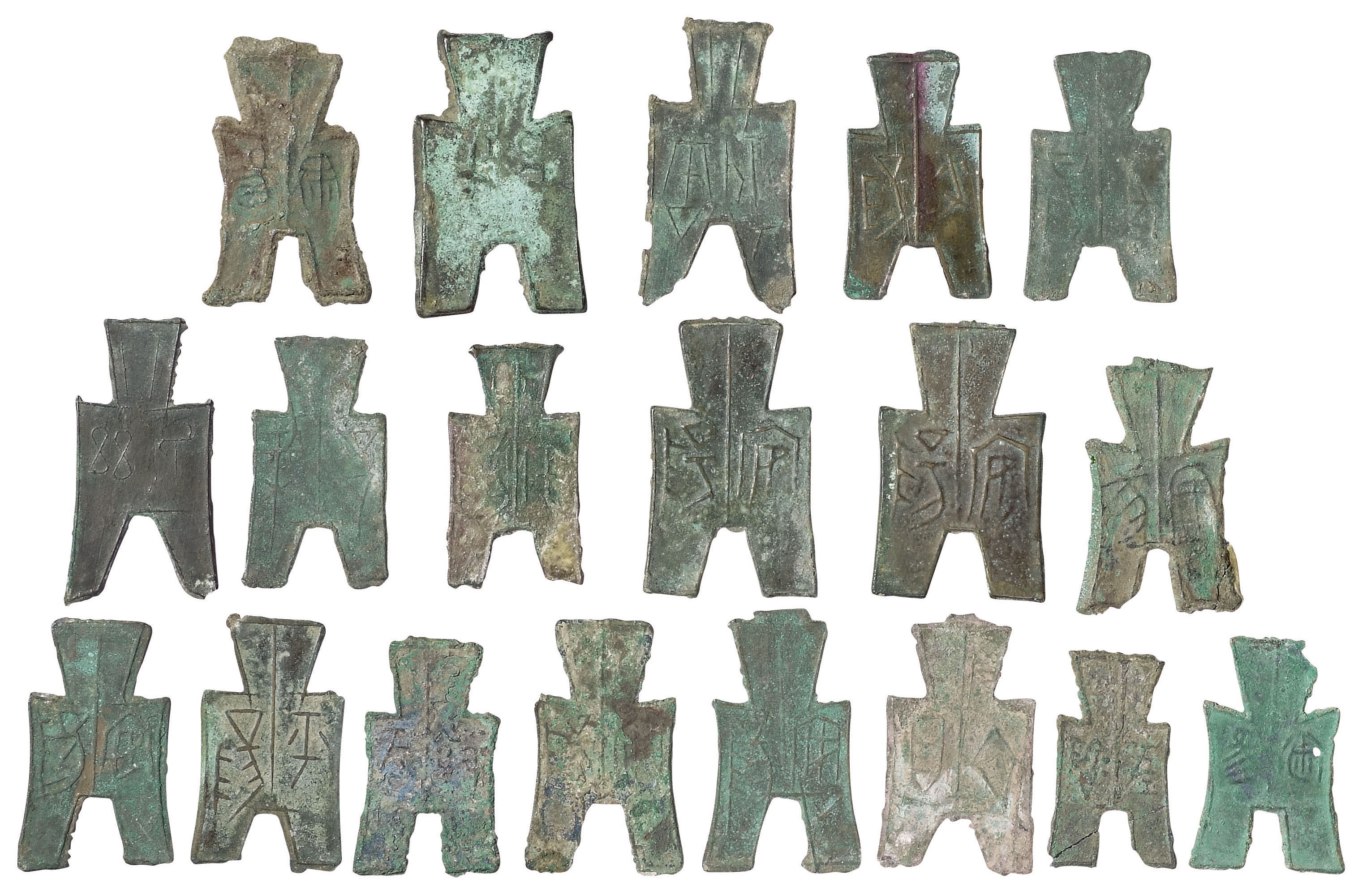 战国时期方足布安阳八枚(二枚残),平阳三枚,齐贝、梁、兹氏、襄坪(脚残)、宅阳、鱼阳、各一枚、尖足布武安一枚,共计十九枚,极美品