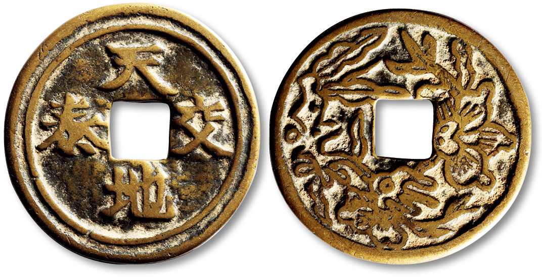 清代“天元通宝”背“文”一枚,直径:32毫米,晚清天地会会钱,铸于浙江地区,存世较少,极美品