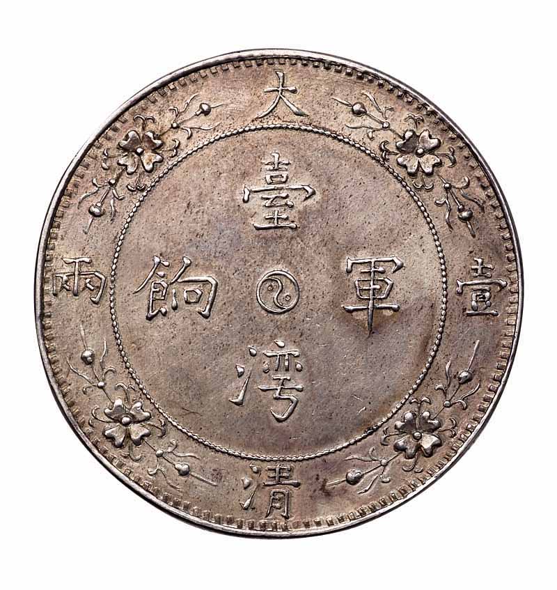 清末台湾军饷大清壹两背龙马图臆造银币一枚,原色原光,品相极好,完全未使用品