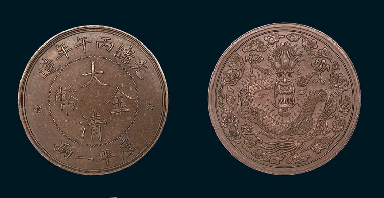 光绪丁未年造大清金币库平一两,清代光绪三十三年(1907年)天津户部造币总厂铸造,铸额极少,未公开发行,正面中央铸“大清金币”,外围镌汉文“光绪丁未年造、库平一两”(时值中国传统干支纪年之丁未年),左右分列梅花星,背面蟠龙,云纹有大、小之分,此币为“小云”版, ...