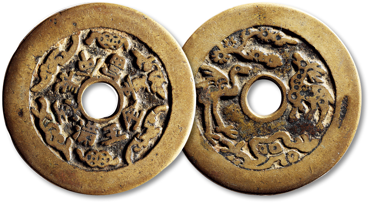 清“金玉满堂长命富贵”背“鹤鹿同春”花钱一枚,直径:47.3mm,上美品