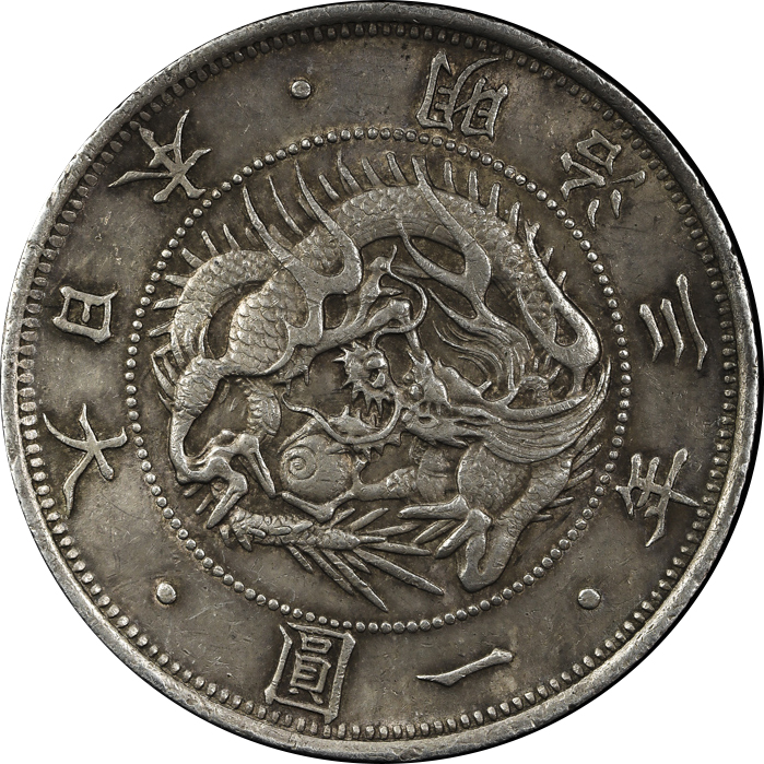 日本 旧一圆银货 Old type 1Yen 明治3年(1870) 日本货币商协同组合鑑定书付 with JNDA cert 縁に小キズ有りトーン VF。JNDA01-9 KM-Y5.1 普通圆 Type1 有轮 倾打60°,日本货币商协同组合鑑定书付 with JNDA cert