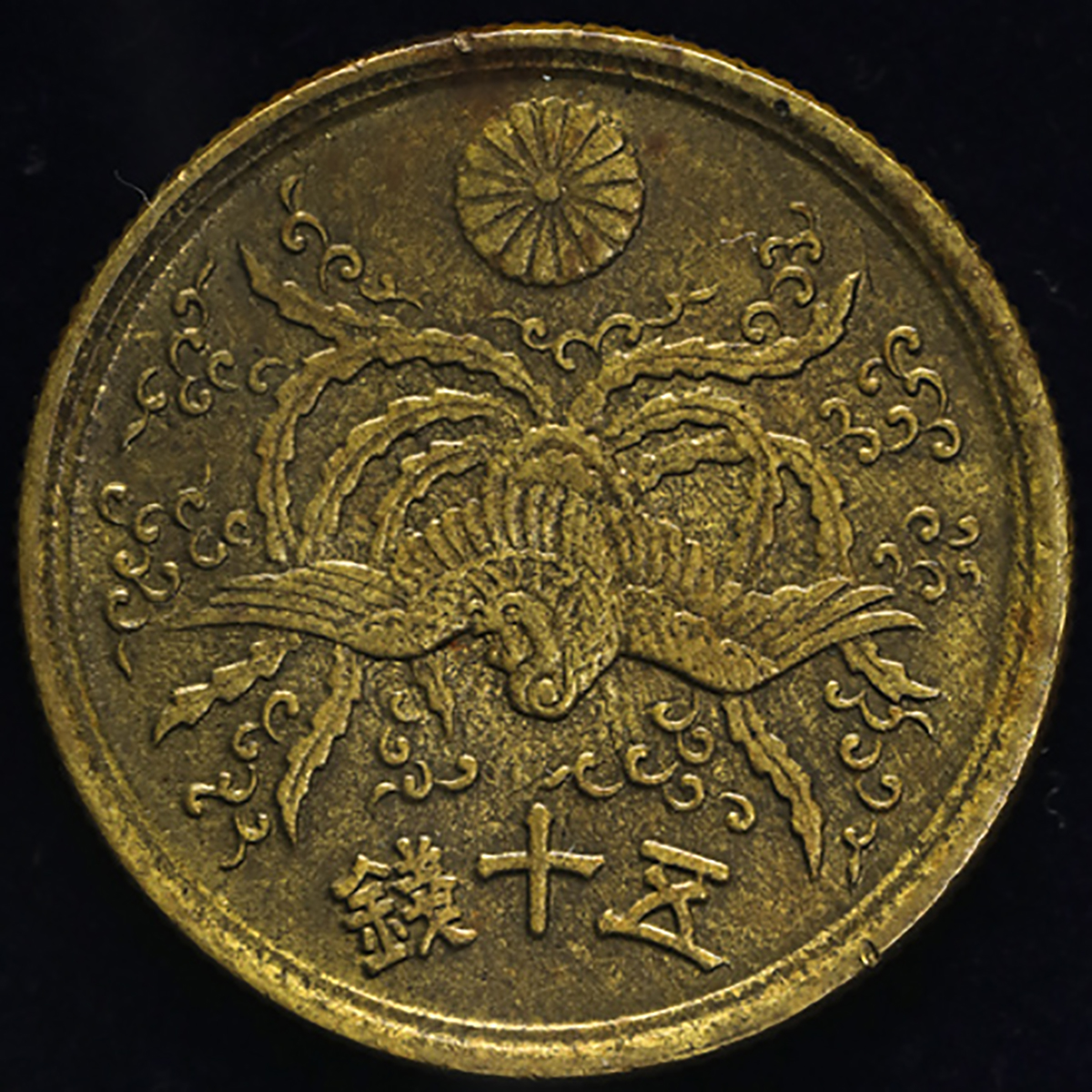 日本 大型五十銭黄铜货 50Sen Brass Large Size 昭和22年(1947) 日本货币商协同组合鑑定书付 with JNDA cert F~VF。JNDA01-18 KM-Y67 昭和22年铭は発行されたが、日本银行に保管されていたものは流通前にほ之んど回収引扬げ鋳溃された F~VF ...