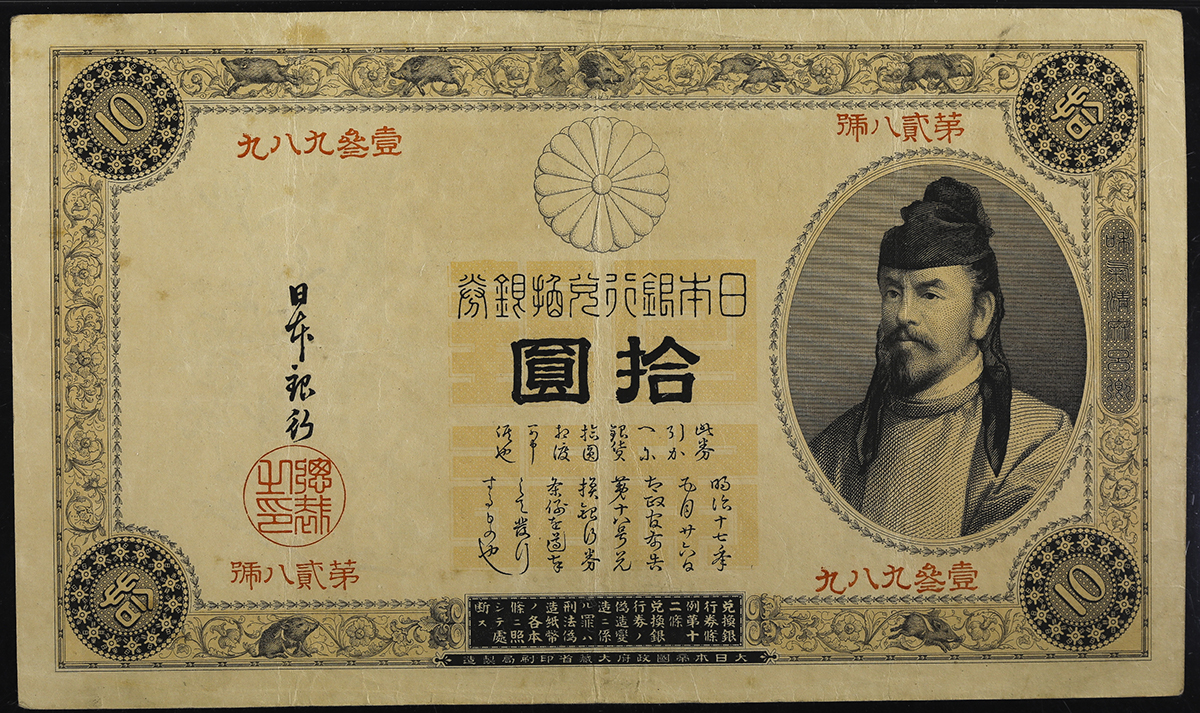 日本 表猪10円札 Bank of Japan 10Yen(Omote-Inoshishi) 明治23年(1890~) 日本货币商协同组合鑑定书付 with JNDA cert PMG-VF30 (VF)美品。JNDA11-27 P-28 组番号”第贰八号”,日本货币商协同组合鑑定书付 with JNDA cert PMG-VF30 ...