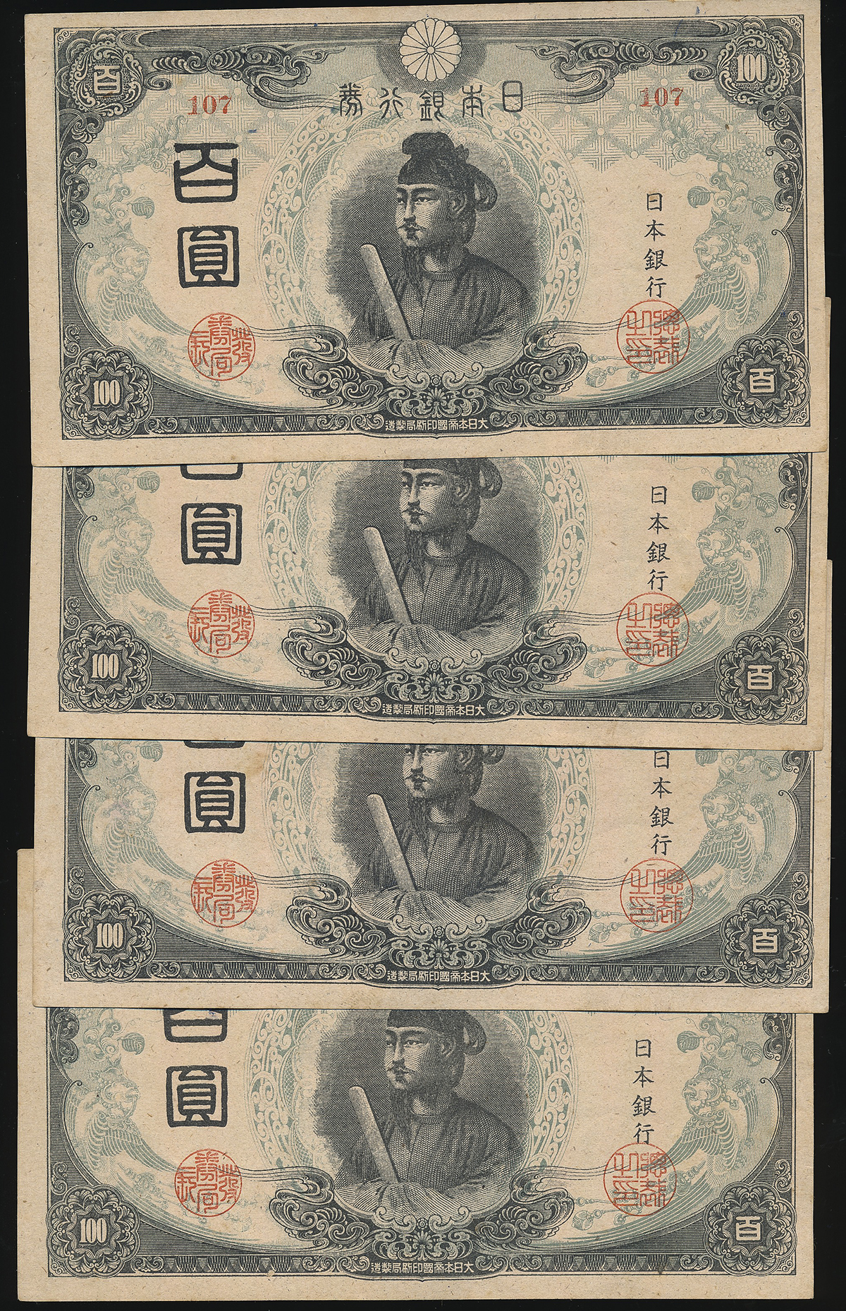 日本 3次100円札 Bank of Japan 100Yen(3rd Shotoku) 昭和20年(1945) 返品不可 要下见 Sold as is No returns 小シミあり(AU~UNC)淮未使用品~未使用品。JNDA11-58 P-78Ab 组番号(107),返品不可 要下见 Sold as is No returns