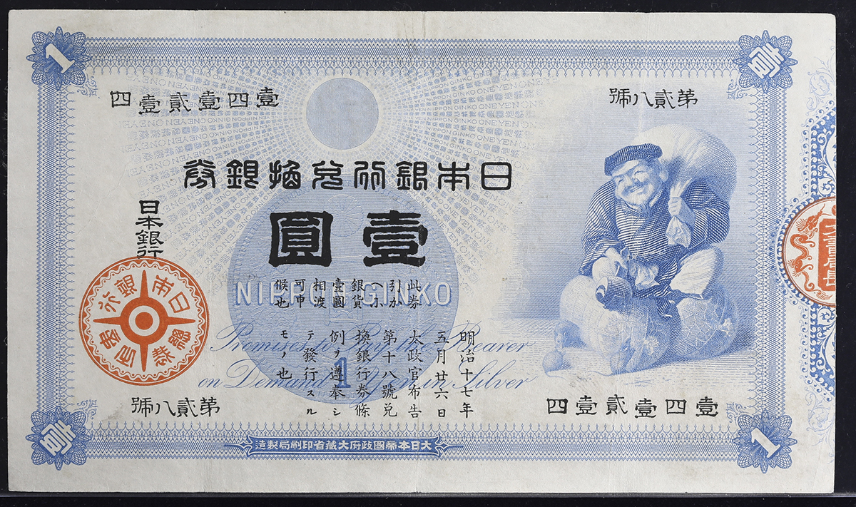 日本 大黒1円札 Bank of Japan 1Yen(Daikoku) 明治18年(1885) 返品不可 要下见 Sold as is No returns 洗浄(VF)美品。JNDA11-25 P-22 组番号”第贰八号” 洗浄(VF)美品