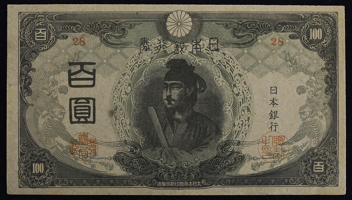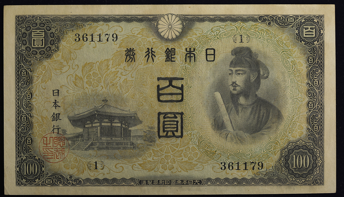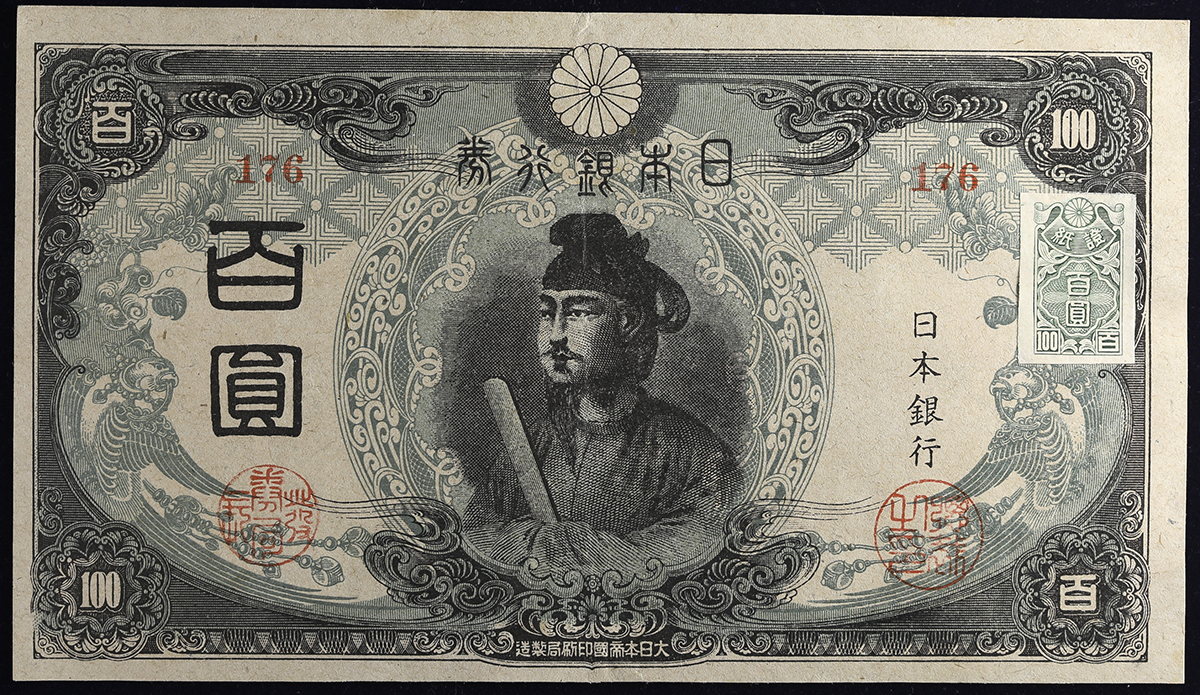 日本 3次100円札 Bank of Japan 100Yen(3rd Shotoku) 昭和20年(1945) (EF)极美品。JNDA11-58 P-81 组番号(176) 証纸付き
