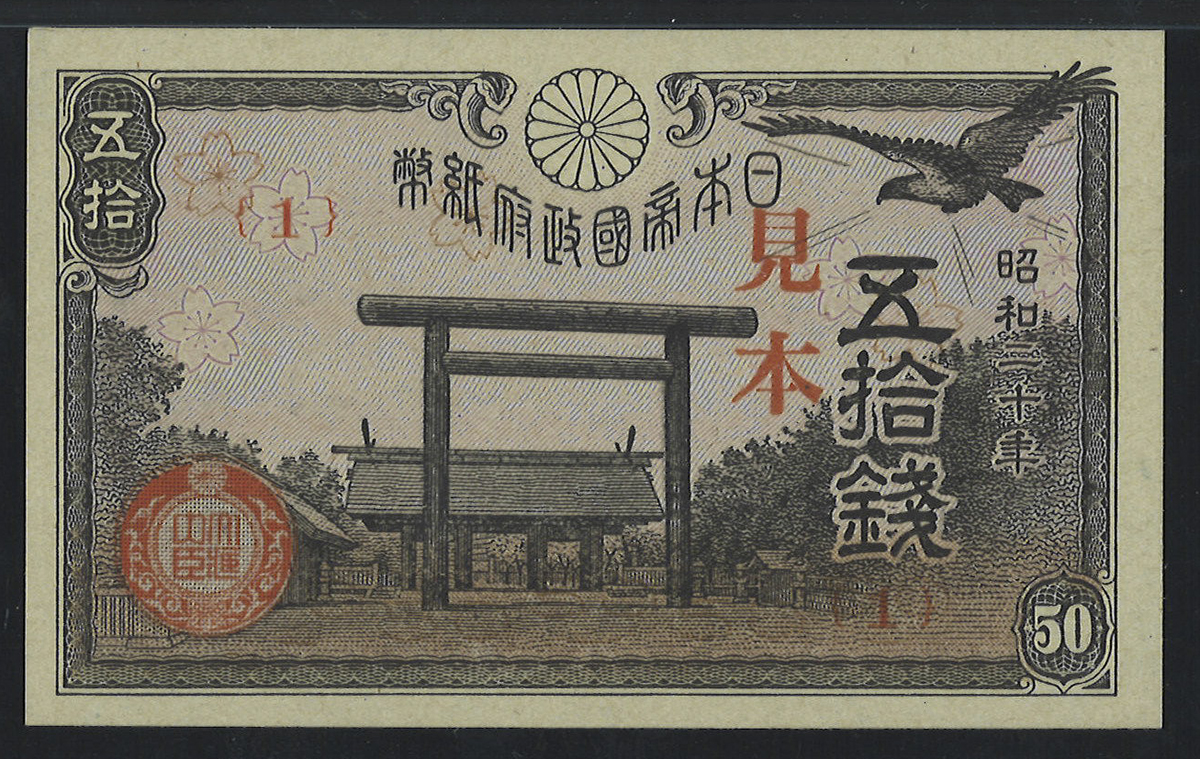 日本 靖国50銭札 Government 50Sen(Yasukuni) 昭和20年(1945) PMG-CU64 EPQ (UNC+)未使用品。JNDA11-61 P-60s1 见本券(1) (UNC+)未使用品