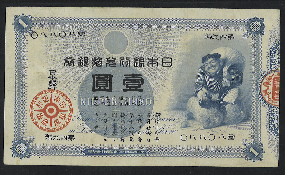 日本 大黒1円札 Bank of Japan 1Yen(Daikoku) 明治18年(1885) PMG-Ch.VF35 NET“Retouched“ リタッチあり(VF)美品。JNDA11-25 P-22 组番号”第四九号”,PMG-Ch.VF35 NET“Retouched“