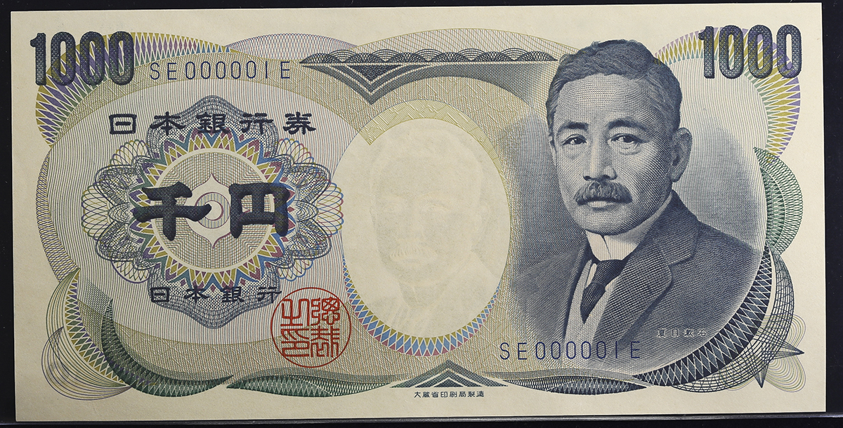 日本 夏目漱石1000円札 Bank of Japan(Natsume) 平成2年(1990)~ (UNC)未使用品。JNDA11-81 P-97d 大藏省印刷局铭青番号2桁 SE000001U (UNC)未使用品
