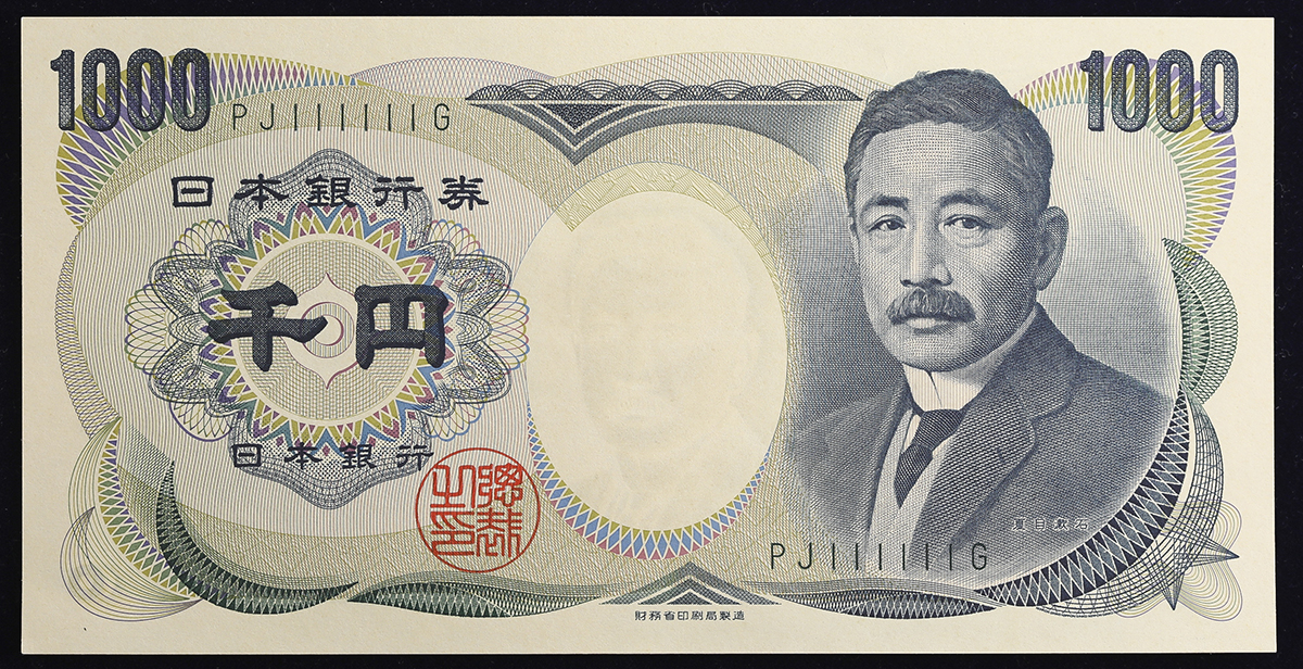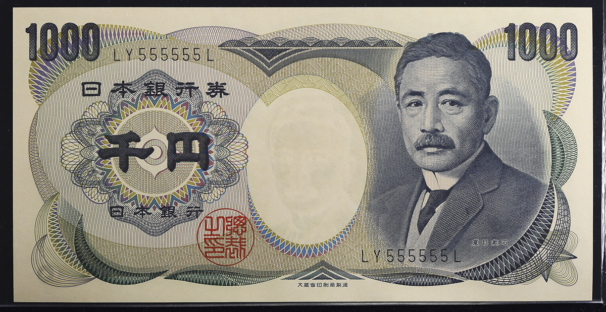 日本 夏目漱石1000円札 Bank of Japan(Natsume) 昭和59年(1984)~ (UNC)未使用品。JNDA11-81 P-97a 大藏省印刷局铭黒番号2桁 LY555555L (UNC)未使用品