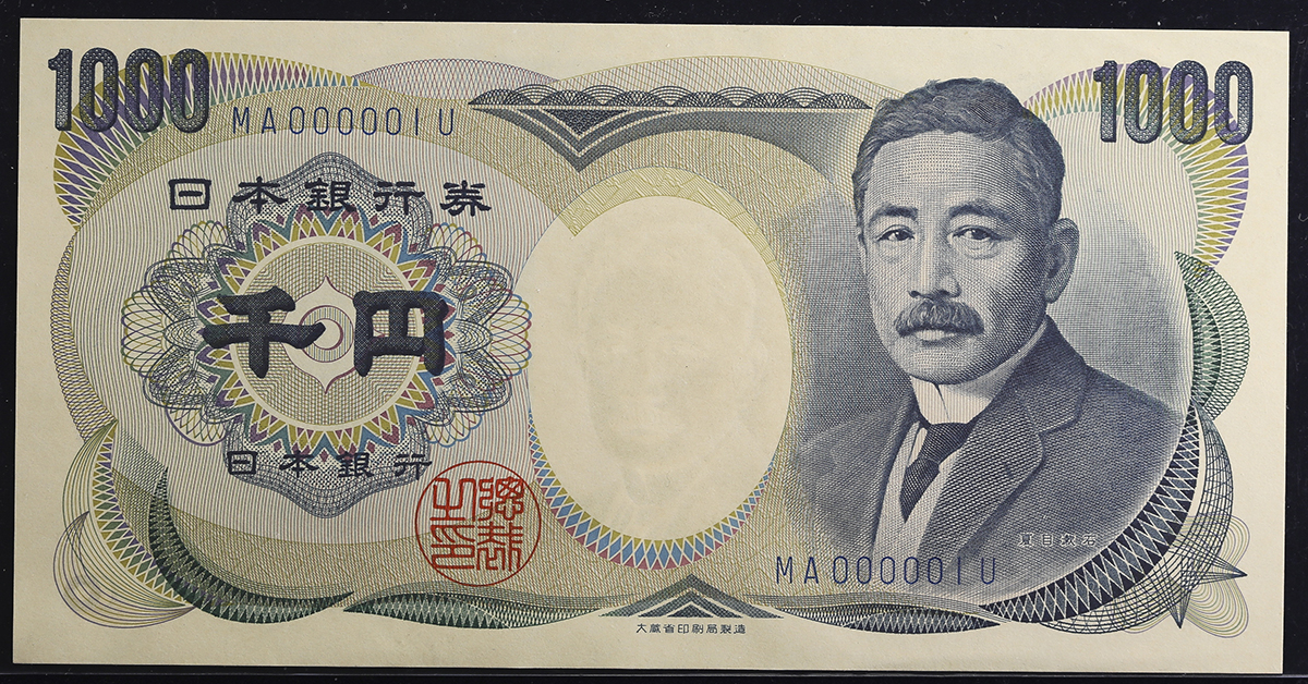 日本 夏目漱石1000円札 Bank of Japan(Natsume) 平成2年(1990)~ (UNC)未使用品。JNDA11-81 P-97d 大藏省印刷局铭青番号2桁 MA000001U (UNC)未使用品