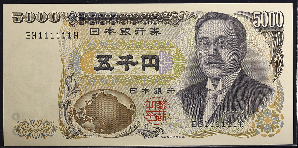 日本 新渡戸蹈造5000円札 Bank of Japan 5000Yen(Nitobe) (UNC)未使用品。JNDA11-80 P-98b 大藏省印刷局铭 黒番号2桁 EH111111H (UNC)未使用品