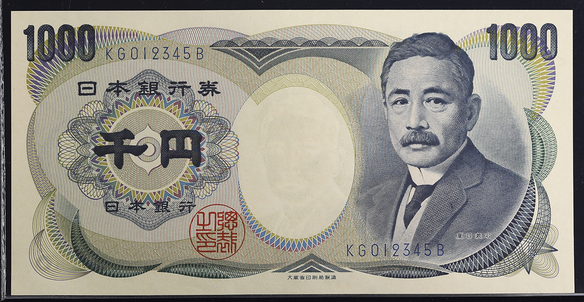 日本 夏目漱石1000円札 Bank of Japan(Natsume) 平成2年(1990)~ (UNC) 未使用品。JNDA11-81 P-97d 大藏省印刷局铭青番号2桁 KG012345B (UNC) 未使用品