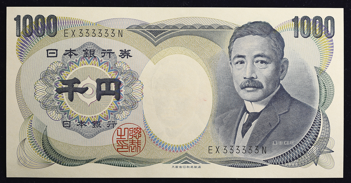 日本 夏目漱石1000円札 Bank of Japan(Natsume) 昭和59年(1984)~ (UNC)未使用品。JNDA11-81 P-97a 大藏省印刷局铭黒番号2桁 EX333333N (UNC)未使用品