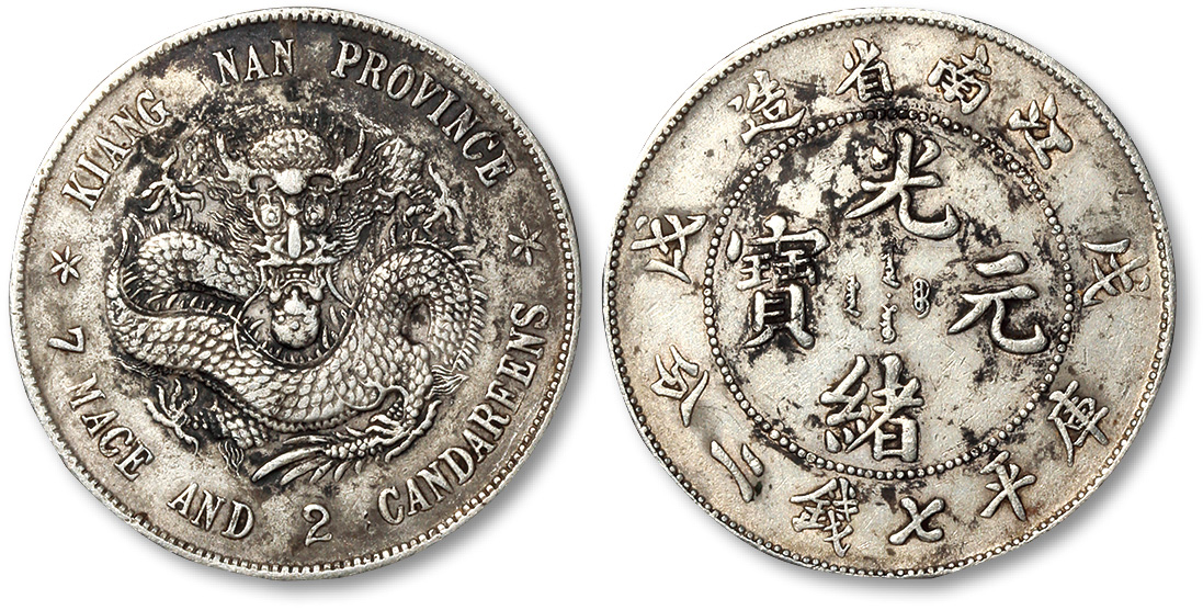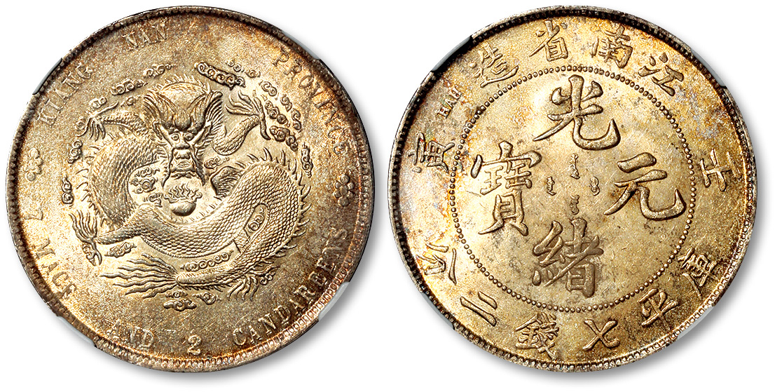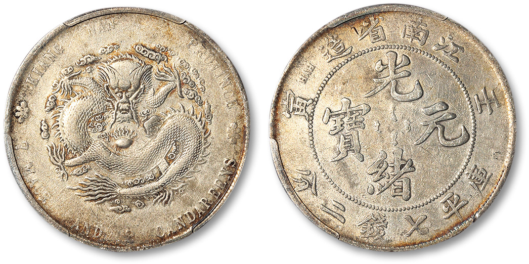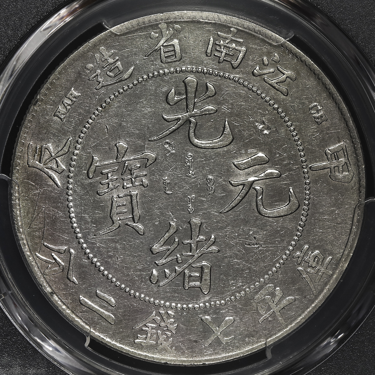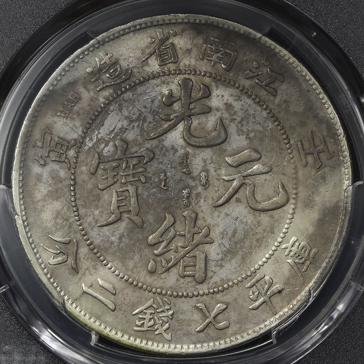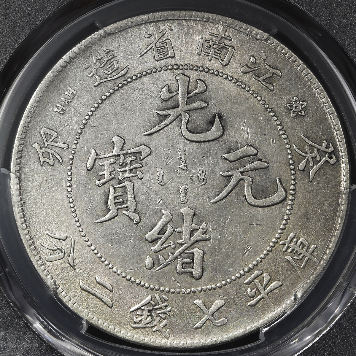 清江南省造光绪元宝库平三钱六分银币一枚,俗称“老江南”,此币打制深峻,龙图完整精美,龙鳞粒粒饱满,自然生动,类镜面底版,龙面MS状态,字面AU状态,原色银光,状态一流,如此品相且开门者在老江南半圆流通币中实为凤毛麟角,向为收藏家所珍爱,金盾PCGS AU55,为此公司 ...