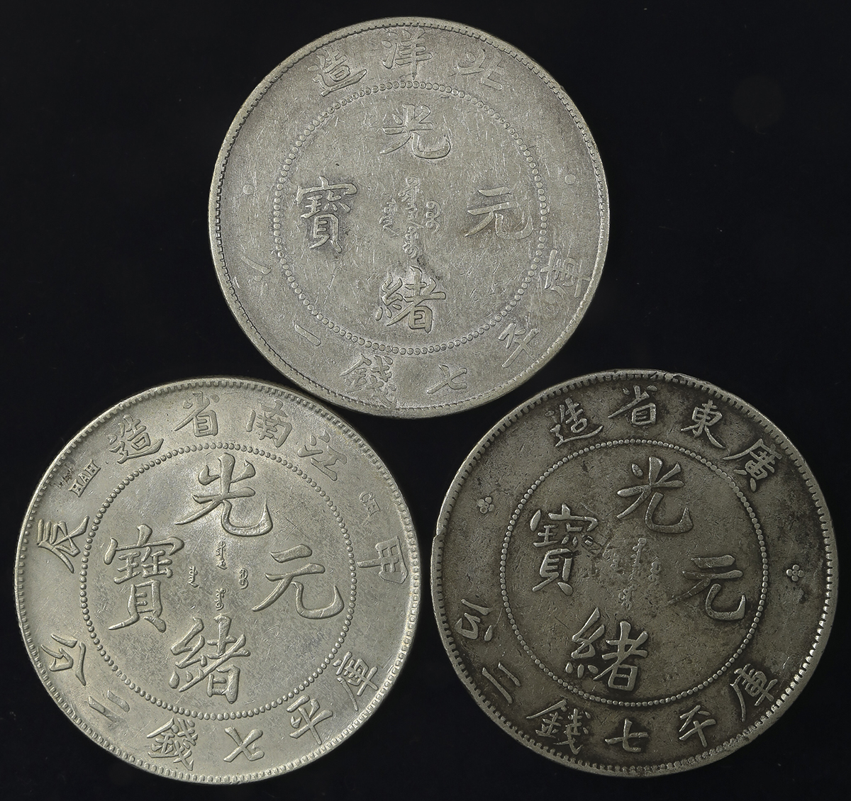 Lot of Modern coins 中国近代货币ロット 光绪元宝七銭二分 (Dollar) 北洋造(直隷省) Chihli 光绪25年(1899), 江南省(Kiangnun) 甲辰(1904), 广东省 Kwangtung ND(1890-1908) 返品不可 要下见 Sold as is No returns VF+~EF+。KM-Y73 L&M-454, KM-Y145a.12 L&M-257, KM-Y203 ...