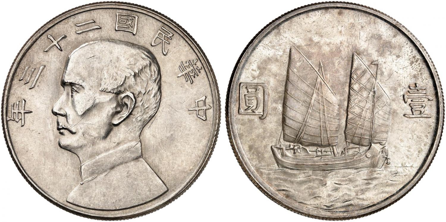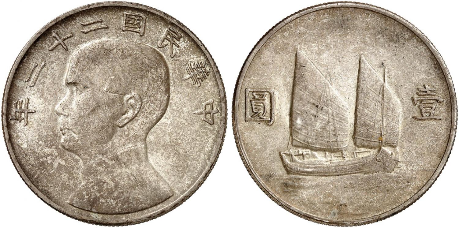 民国二十三年孙中山像背帆船壹圆银币一枚,面墨戳,字迹清晰完整,原味包浆,光度一流,状态极佳,完全未使用品