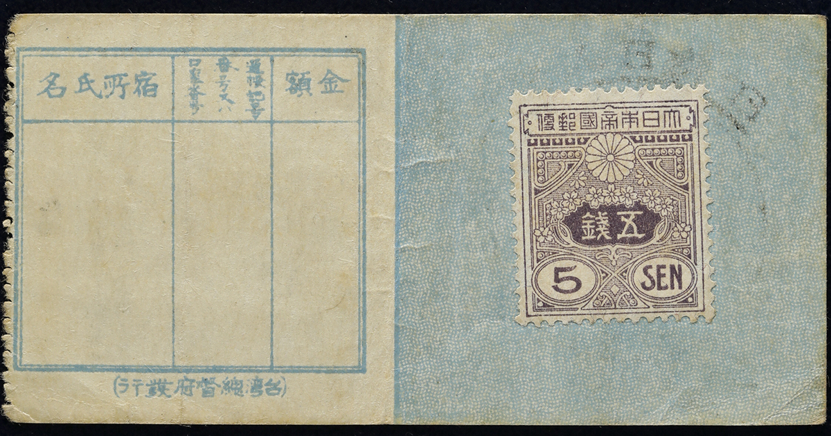 台湾総督府 Emergency Potage Stamp Subsidiary 5銭(Sen) ND(1917) 返品不可 要下见 Sold as is No returns (VF)美品。P-1914,返品不可 要下见 Sold as is No returns
