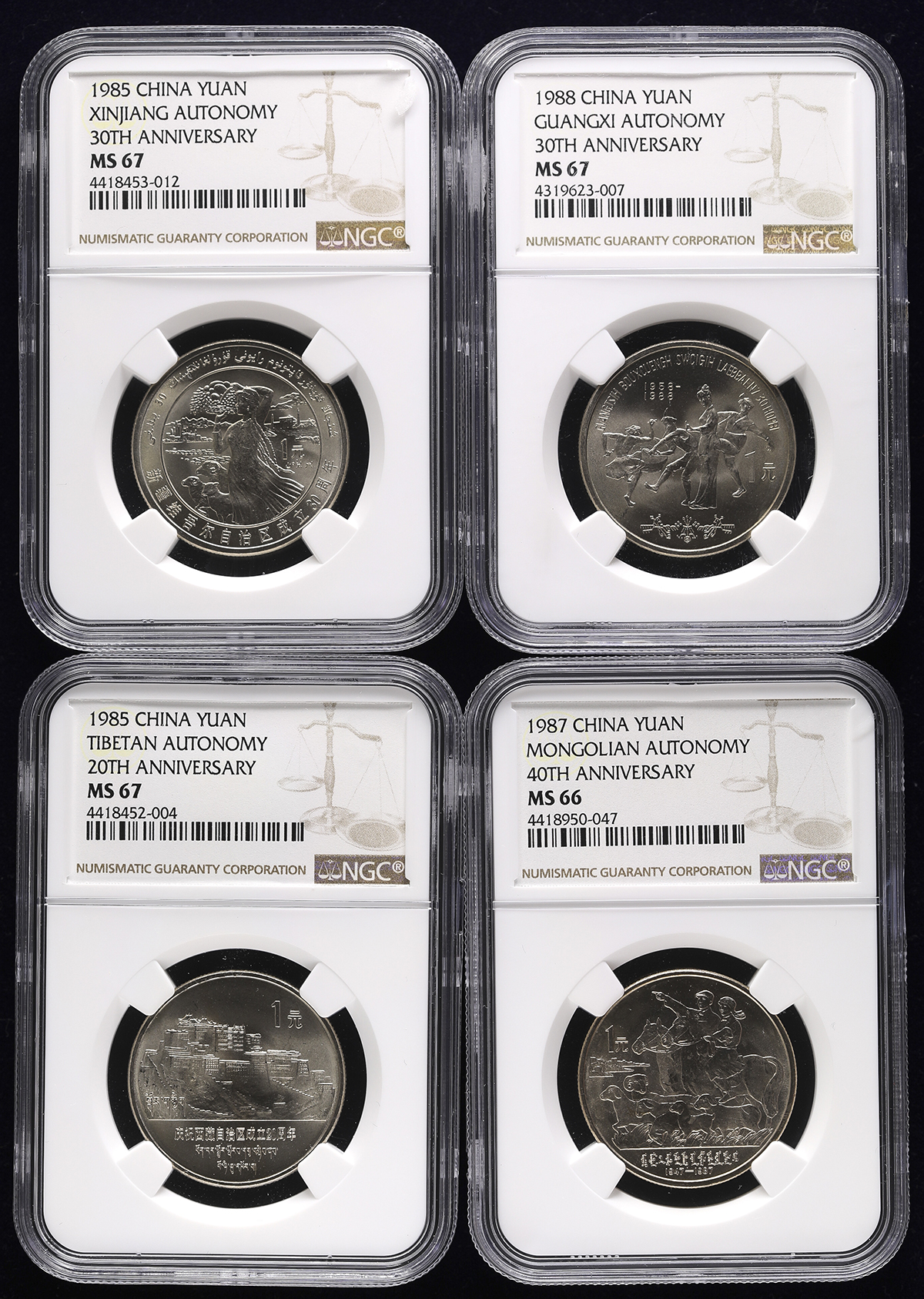 中华人民共和国 People‘s Republic of China 1元(Yuan) 1985(×2),87,88 NGC-MS66, MS67(×3) UNC。KM-110,111,158,180 白铜货,NGC-MS66, MS67(×3)