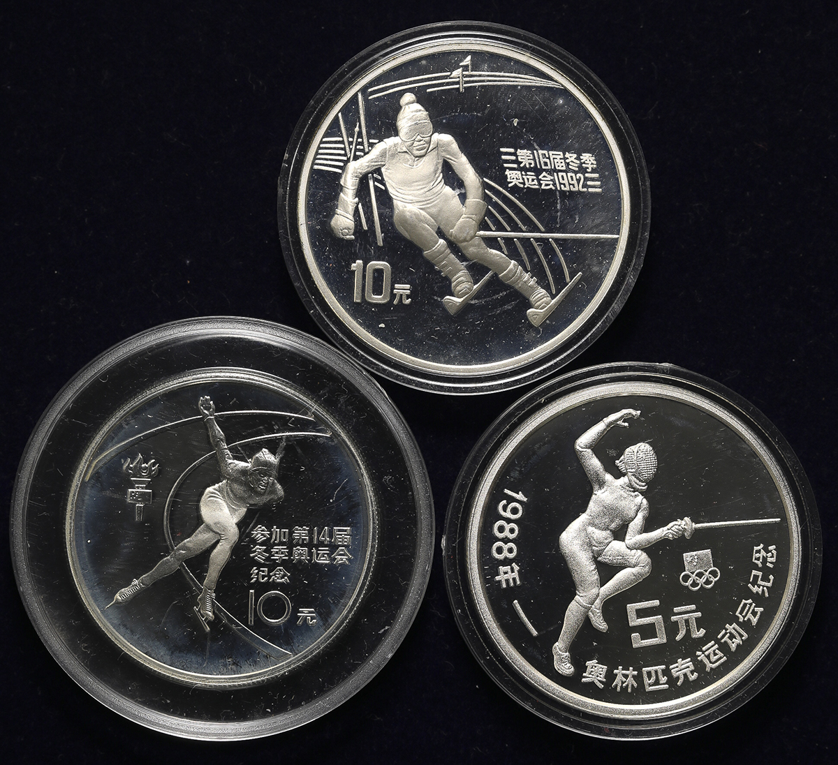 1984年第二十三届夏季奥林匹克运动会纪念银币——女排运动员,面值10元,重量1/2盎司,成色92.5%,发行量6000枚;1988年第15届冬奥会-男子滑降.[全部错刻为16届],面值5元,重量27克,成色90%,镜面,发行量10000;1984年第14届冬奥会-速度滑冰精製银币,面值10元,重量1/2盎 ...
