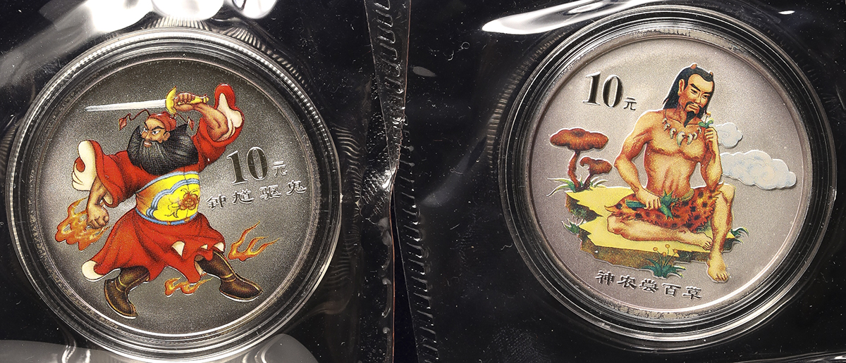 中华人民共和国 People‘s Republic of China Proof Set 2002 保証书付 オリジナ儿ケース付 with original case。KM-1428,1429 中国民间神话故事系列记念币第2组 钟馗驱邪,神农尝百草, カラー1オンス(1Oz)银货2种セット,保証书付 オリジナ儿ケース付 with original case ...
