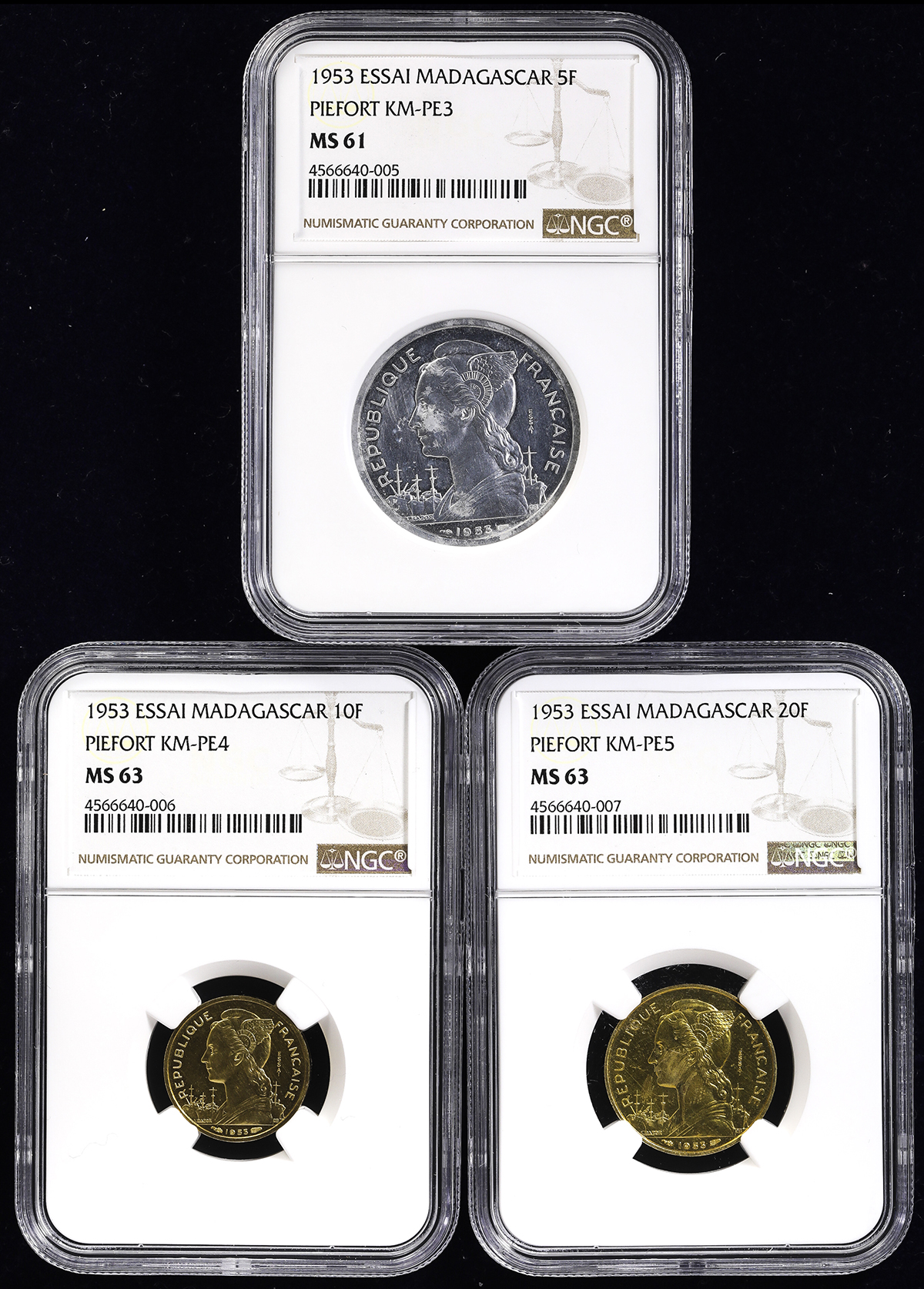 MADAGASCAR マダガスカ儿 Piefort Essai 5,10,20Francs 1953 NGC-MS63,63,61 AU~UNC