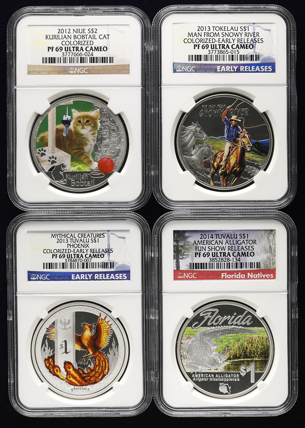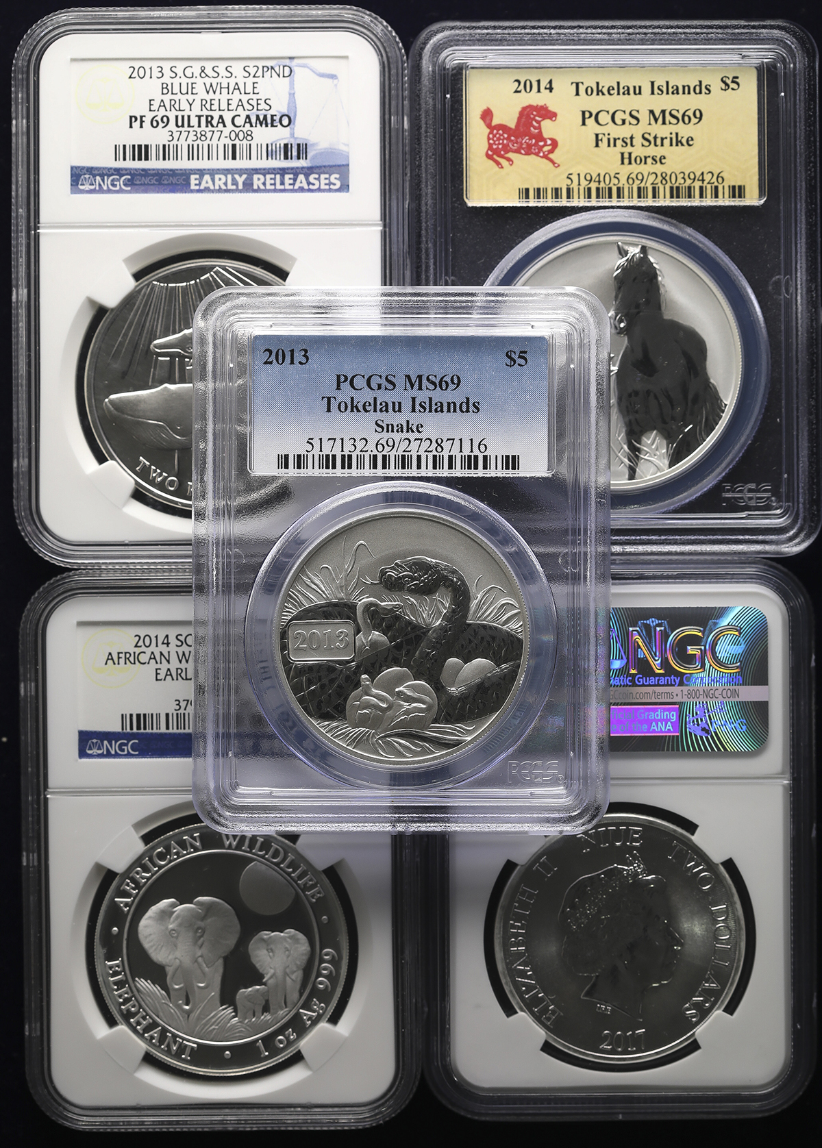 Lot of asian, african&oceanian coins アジア、アフリカ、オセアニア各国のロット ニウエ2Dollars2012、トケラウDollar2013、ツバ儿Dollar2013(×2)&Dollar2014 全てNGC-PF69 Ultra Cameo 返品不可 要下见 Sold as is No returns Proof。クラウンサイズ カラー银货,全てNGC- ...