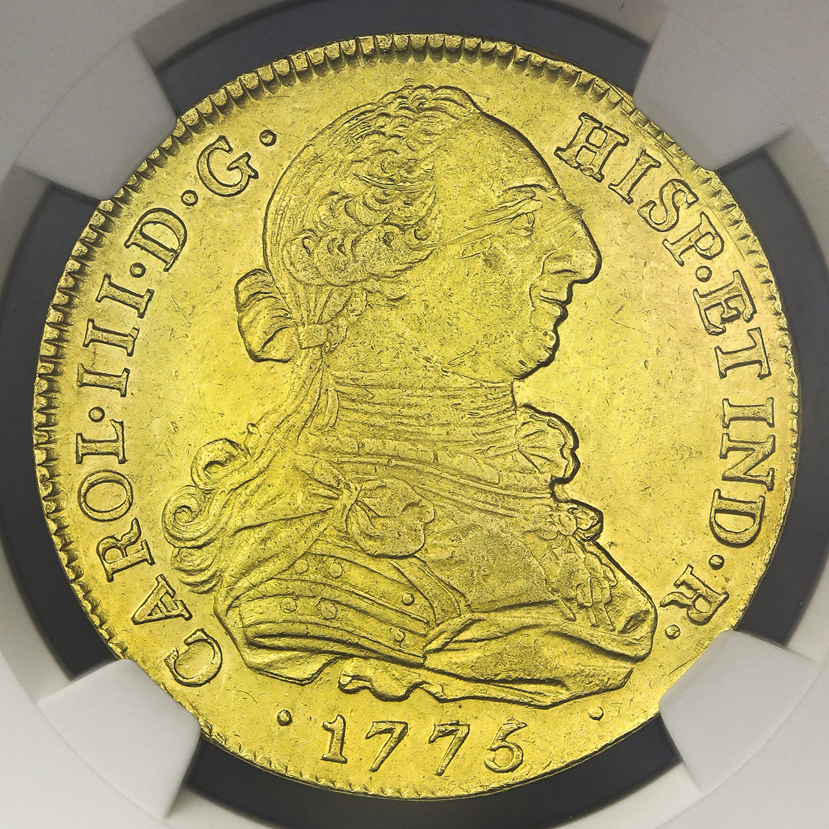 COLOMBIA コロンビア 8Escudos 1775JS NGC-AU Details“Obv.Damage“ 颜にスクラッチある以外 EF+。Fr-36 KM-50.2 カ儿ロス3世 ポパヤン,NGC-AU Details“Obv.Damage“