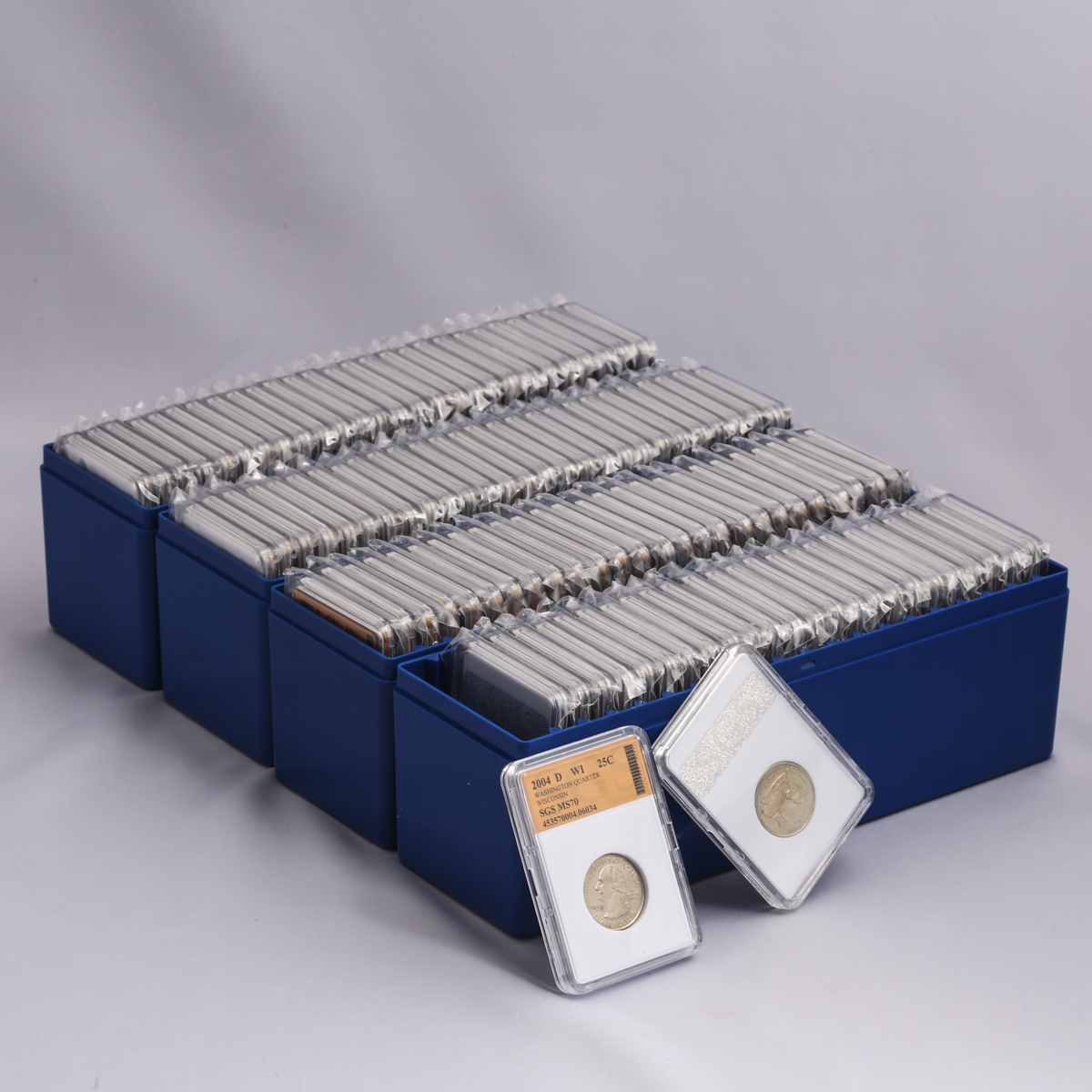 USA アメリカ合众国 25Cents 1999~2008各PD KM-293~425 ステート・クォーター(白铜)51州102种全揃+2009P DC&テリトリー・クォーター(白铜)6种全揃、Lot of 108pcs 计108种组 全てSGS-MS70のケースに入っている。返品不可 要下见 Sold as is No returns UNC。 UNC ...