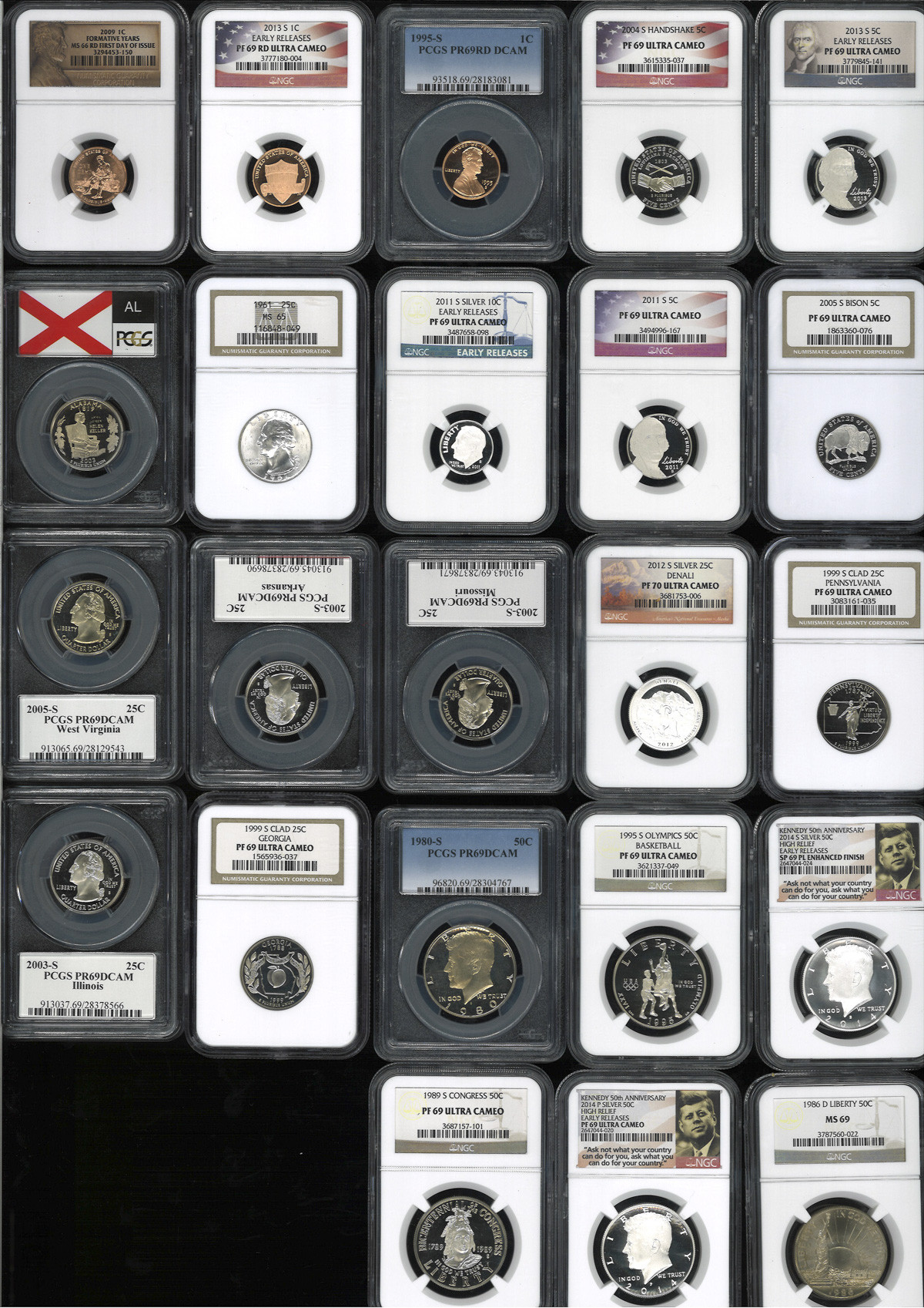 USA アメリカ合众国 Cent(×3)、5Cents(×4)、10Cents(×1)、25Cents(×9)、50Cents(×6) 计23枚组 23pcs 全てNGCやPCGSのケースに入っている 返品不可 要下见 Sold as is No returns UNC(Proof)。 UNC(Proof)