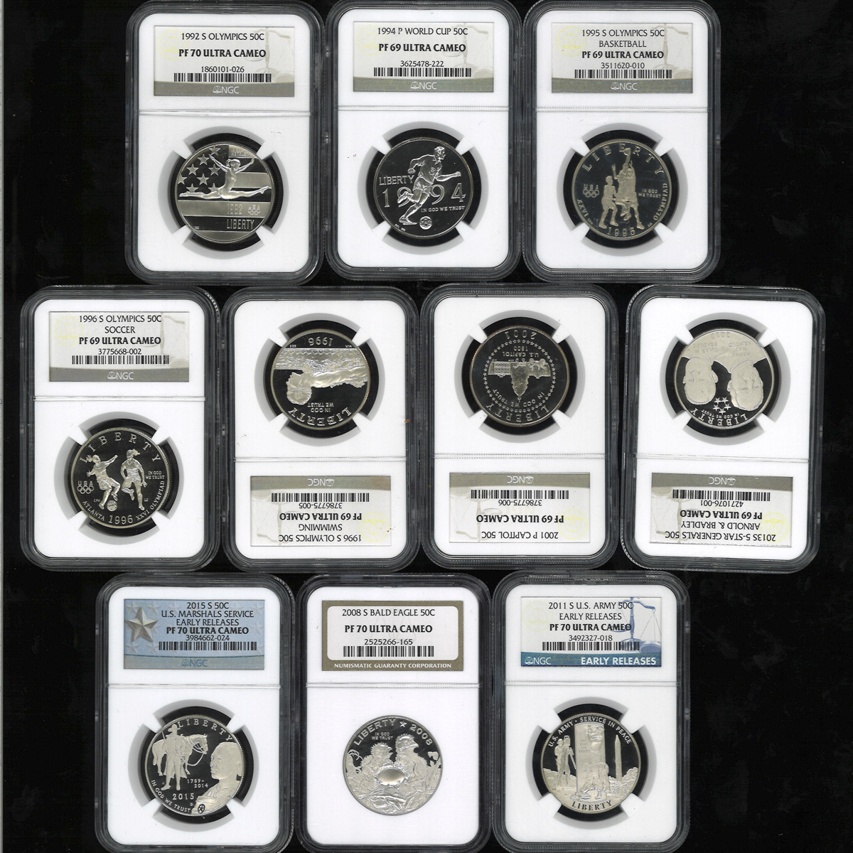 USA アメリカ合众国 Commemotative 50Cents1992S,1994P,1995S,1996S(×2),2001P,2008S,2011S,2013S,2015S NGC-PF69(×6)&70(×4) Ultra Cameo 返品不可 要下见 Sold as is No returns Proo。KM-233,246,257,267,271,323,438,506,554,602 现代50セント记念白铜货,NGC-PF69(× ...