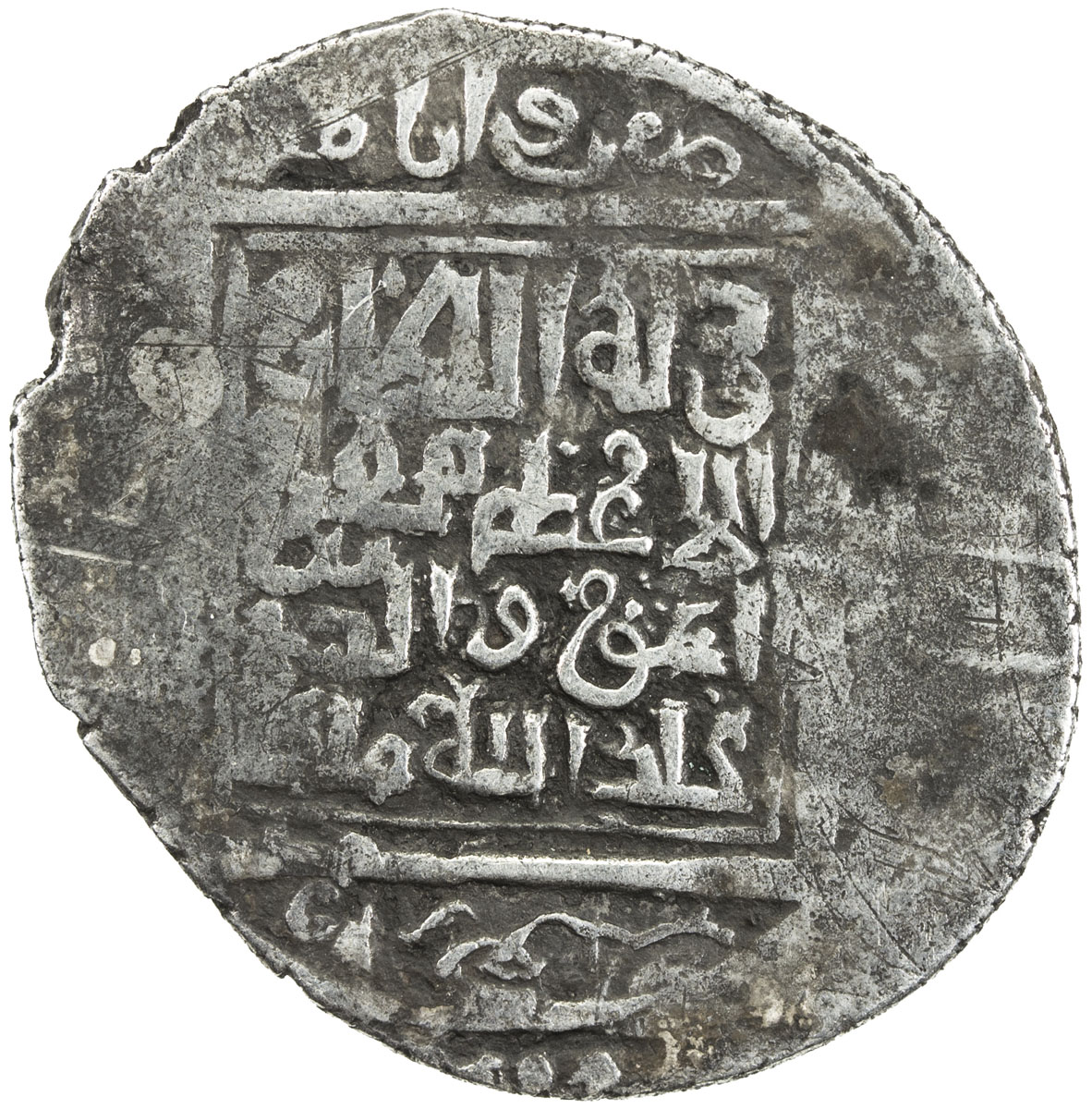 Islamic - Iran (The Early Period),MATTID: Muhammad b. al-Husayn, fl. 995-996, AE fals (2.98g), Isbijab, AH385, A-1477N, also citing the Samanid overlord Nuh III b. Mansur below the reverse, and the dynastic name matt in the obverse center, VF, RRR. The ...