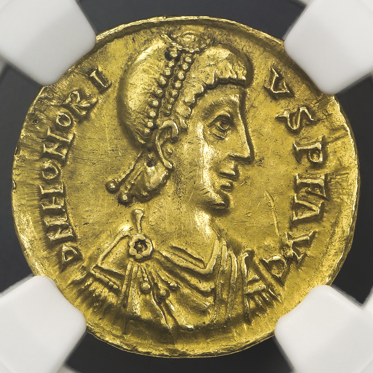 Roman Empire ローマ帝国 AV Solidus Honorius ホノリウス AD393~423 NGC-AU“Strike4/5 Surface3/5 edge marks“ 縁に小伤あり EF。右向き胸像/敌を踏みつける皇帝立像 ラヴェンナ鋳(AD402~406) Fr-904 S-20916 RIC-1287 (4.46g),NGC-AU“Strike4/5 Surface3/5 edge marks“ ...