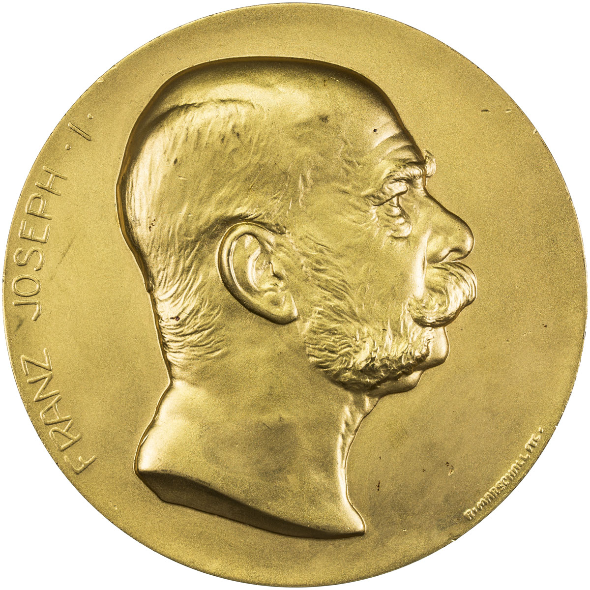 World Coins - Europe,AUSTRIA: Franz Josef I, 1848-1916, AE medal (231.4g), 1910, Hauser-3131, 90mm gilt bronze high-relief State Prize Medal of the 1st International Hunting Exhibition in Vienna by R. Marschall, bust right with FRANZ JOSEPH .I. around , f ...