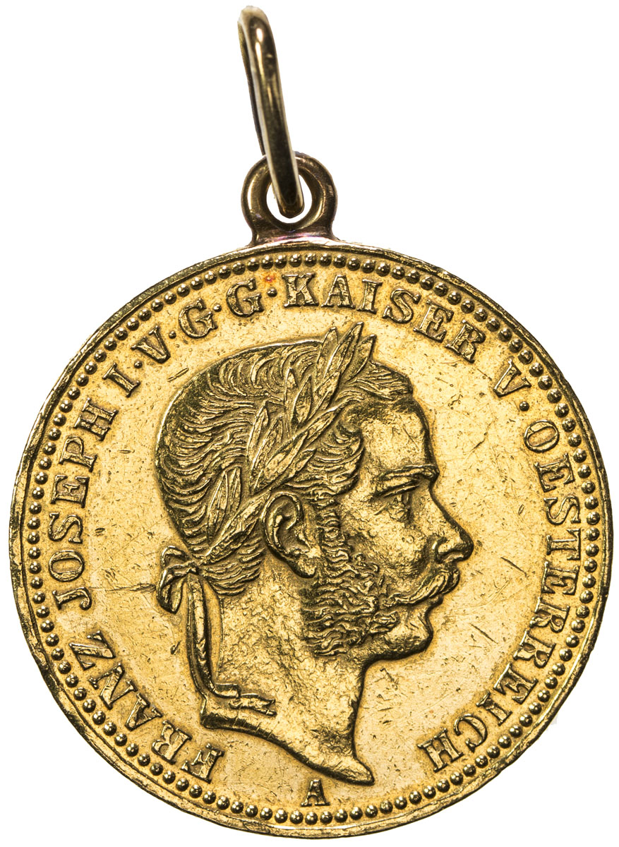 World Coins - Europe,AUSTRIA: Franz Josef I, 1848-1916, AV krone (11.43g), 1866-A, KM-2255, loop attached, weight includes the loop, actual weight for this type is 11.10g, lightly polished (from use in jewelry), EF, RR.