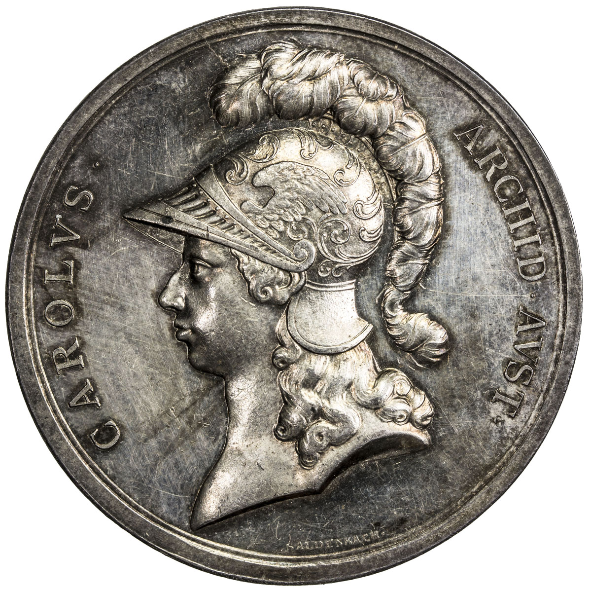 World Coins - Europe,AUSTRIA: AR medal (26.24g), 1799, H-882, J-672, E-781, 48mm, Austrian Victory in the Battle of Stockach by Baldenbach, CAROLVS / ARCHID AVST, helmeted head left of Archduke Charles of Austria, BALDENBACH in small letters at bottom , V ...