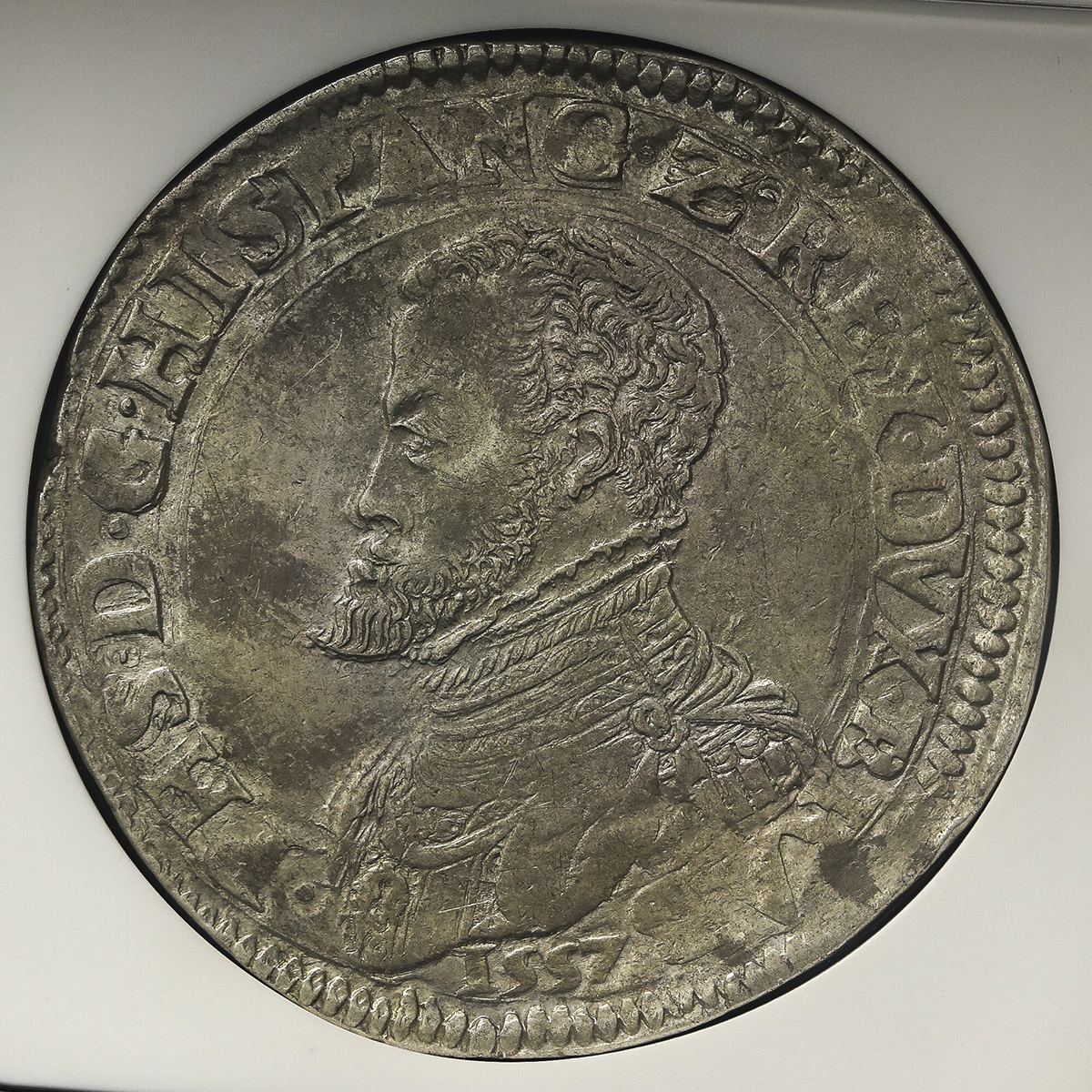 BELGIUM Spanish Netherland,Brabant スペイン领ネーデ儿ラント ブラバント Filippsdaalder(Ecu,Ducaton)1557 NGC-AU58 EF+。Dav-8625 Del-12 フェリペ2世 アントワープ (34.50g),NGC-AU58