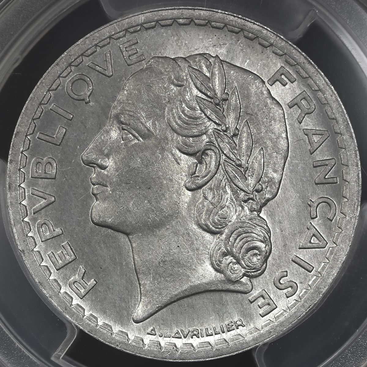FRANCE 4th Rep 第四共和政(1946~1958) Essai 5Francs 1945 PCGS-SP64 见本打 UNC+。Maz-2748(R2) GEM-145.10 Design by Lavriller 试作5フランア儿ミニウム货 制造1100枚 Ⓡ ,PCGS-SP64