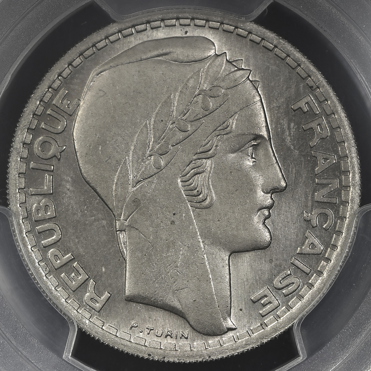FRANCE 4th Rep 第四共和政(1946~1958) Essai 10Francs 1945 PCGS-SP66 见本打 -FDC。Maz-2746(R2) GEM-180.1 Design by Turinn 试作10フラン白铜货 Ⓡ ,PCGS-SP66