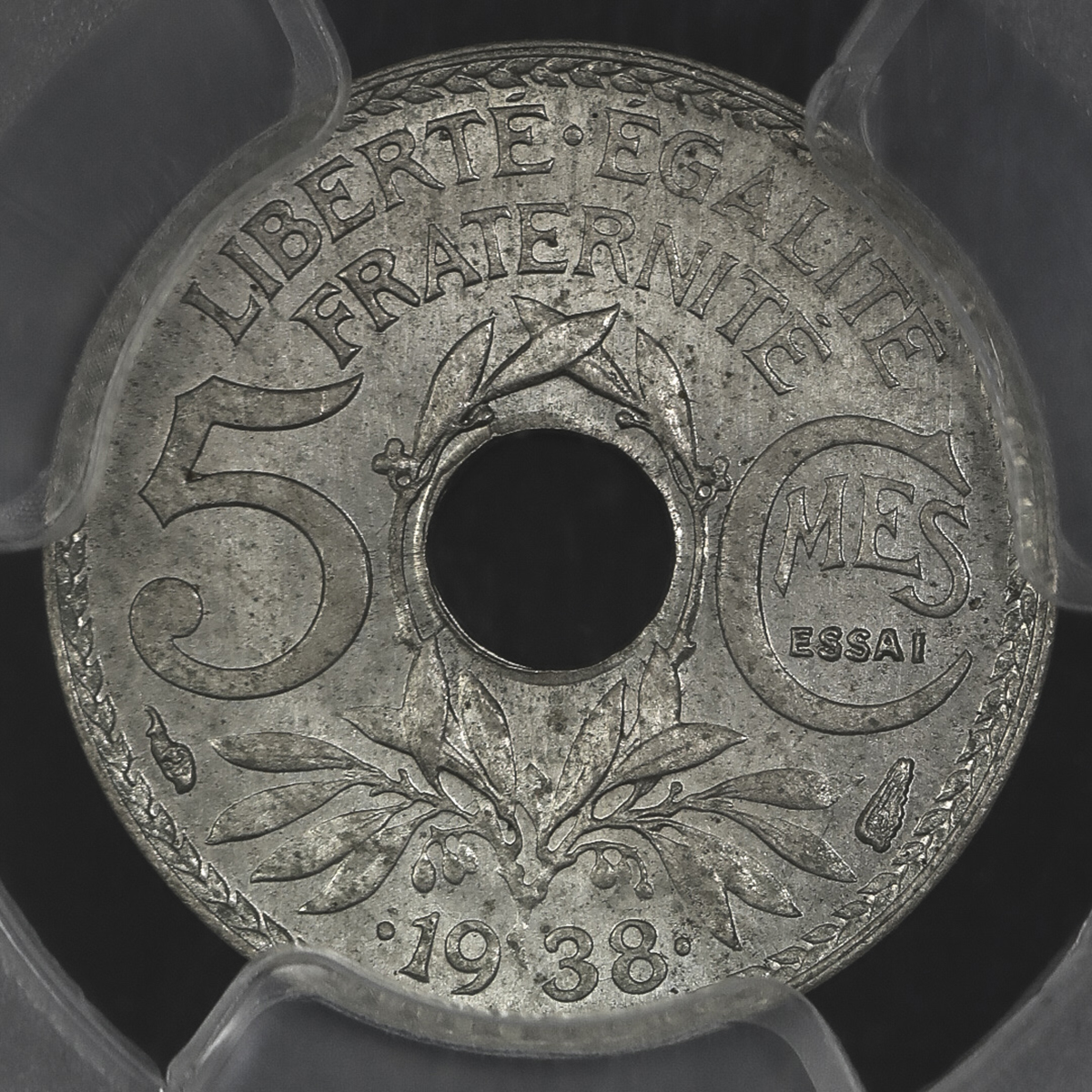 FRANCE 3rd Rep 第三共和政(1870~1940) Essai 5Centimes 1938 PCGS-SP66 见本打-FDC。Maz-2605(R1) GEM-19.1 Gad-171 Design by Lindauer 试作5サンチーム白铜货 Ⓡ ,PCGS-SP66