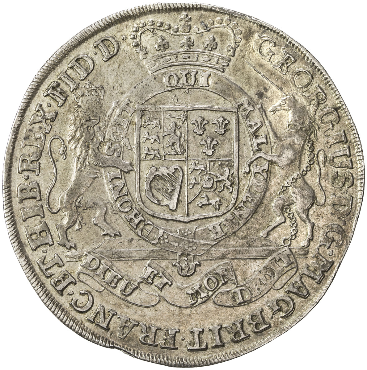 World Coins - Europe,BRUNSWICK-LÜNEBURG-CALENBERG-HANOVER: George I of Great Britain, 1714-1727, AR thaler (28.88g), Zellerfeld, 1727-EPH, KM-114, crowned British arms , wildman standing, holding tree, edge defect at 6:30, lovely VF to EF, ex Don Erickso ...