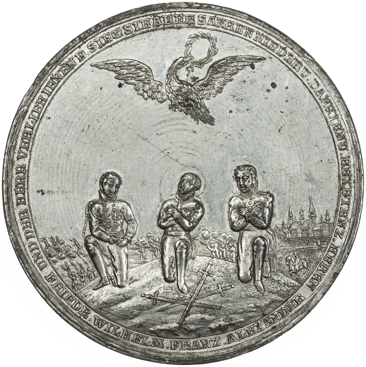 World Coins - Europe,BRANDENBURG-PRUSSIA: tin medal, 1813, Julius-2677, 58mm, Medal on the Battle of Nations and the so-called Holy Moment of the Battle of Leipzig, UND DER HERR VERLIEH IHNEN D. SIEG SIE ABER SANKEN NIEDER U. DANKTEN U. BETETEN Z. HERRN u ...