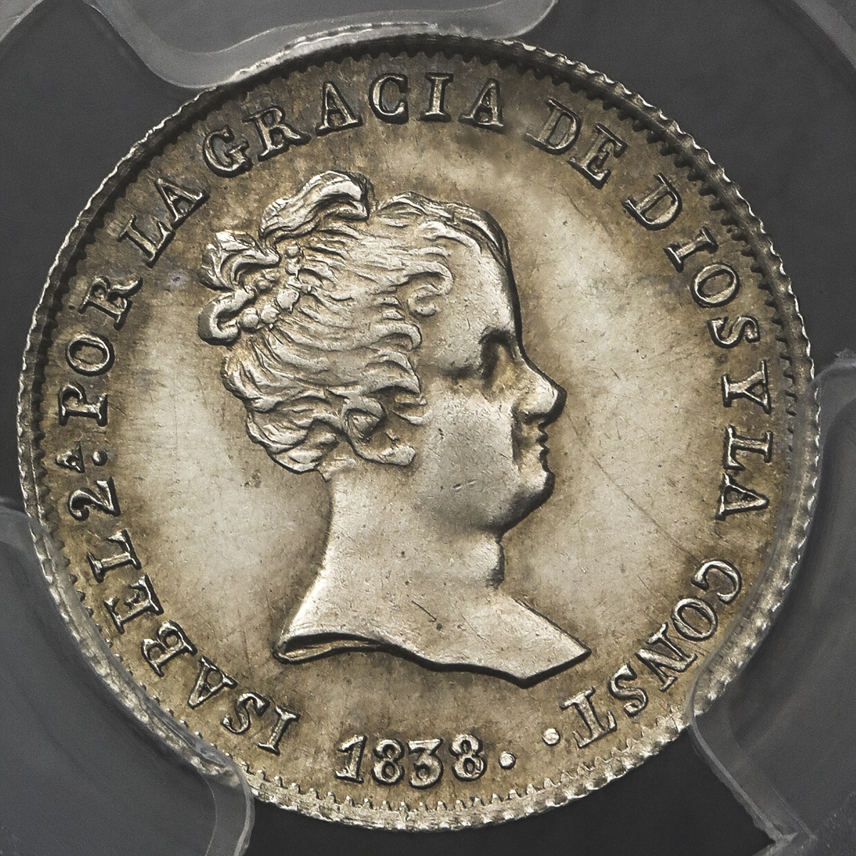 SPAIN スペイン Real 1838DG PCGS-MS62 プ儿ーフライク UNC。KM-518.1 Cal-408 イザベラ2世 マドリッド(彫版局) この年のみに制造された赠呈用之思われる小型银货。プ儿ーフの确証はないものの雰囲気は特别打ちそのものである Ⓡ,PCGS-MS62 ...