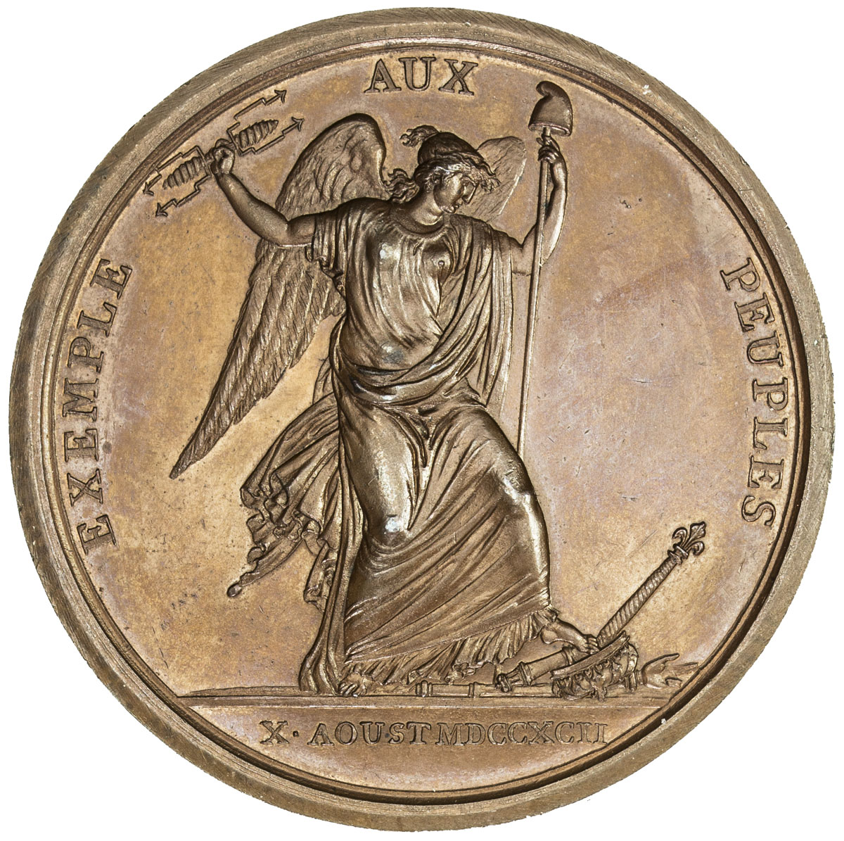 World Coins - Europe,FRANCE: First Republic, AE medal (74.54g), 1792, Hennin-363, 56mm, restrike bronze medal for the Storming of the Tuileries on August 10, 1792, winged Liberty holding pike with cap atop in left hand and a lightning rod in right, breaki ...