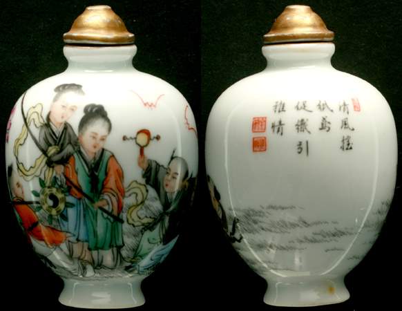 Varia Snuffbottle um 1890/1940. Silber mit Bodenmarken "Sheng Wen ... Shang". Beiderseits Darstellung zweier Frauen. Hohe 80 mm; 38,1 g. Im Deckel roter Stein