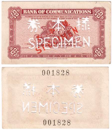 Banknoten 2 Stuck: 10 Cent, Bank of Communications 1927. Specimen, einseitig gedruckte Rs., perforiert. Vs. nur Kn. 2000 Customs Gold Units 1947. Central Bank of China. Specimen. gelocht, Rs. nur Nummer. Pick 341, 141s II