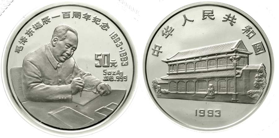 Volksrepublik seit 1949 50 Yuan 5 Unzen Silbermunze 1993. 100. Geburtstag von Mao Zedong. Mao Zedong am Schreibtisch. Originalverschweit in Holzschatulle mit Zertifikat (Nr. 913), Umverpackung. (Zertifikat mit Kugelschreiber und Bleistift etwas beschriftet ...