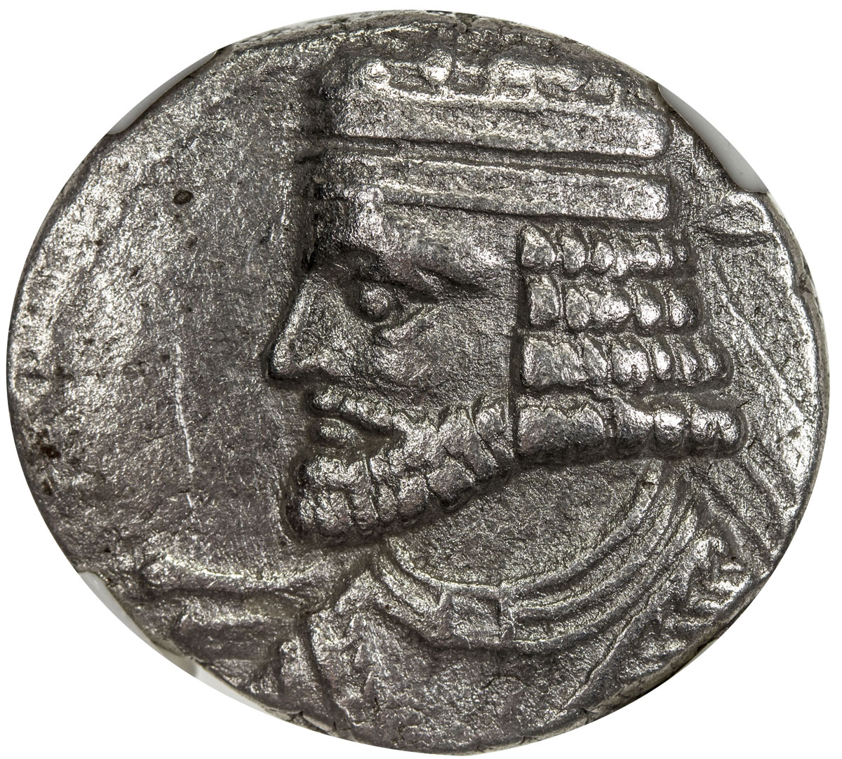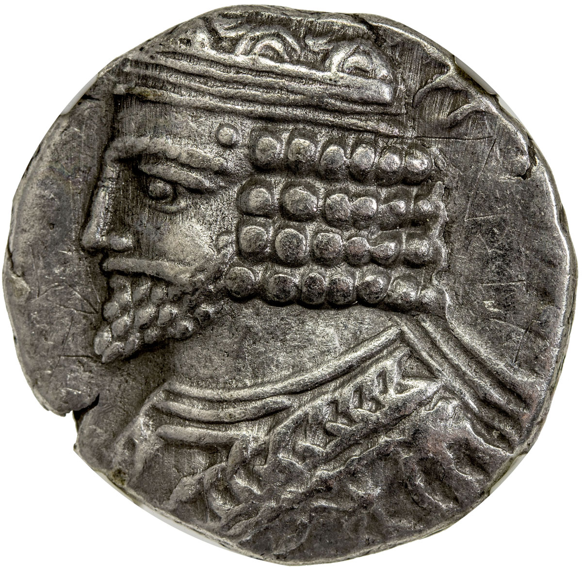 Ancient - Near East,PARTHIAN KINGDOM: Gotarzes II, ca. AD 44-51, BI tetradrachm, diademed bust left , Gotarzes enthroned right, receiving palm branch from Tyche standing left holding scepter,with year HNT (Sel-358), month off flan, encapsulated in NGC hol ...