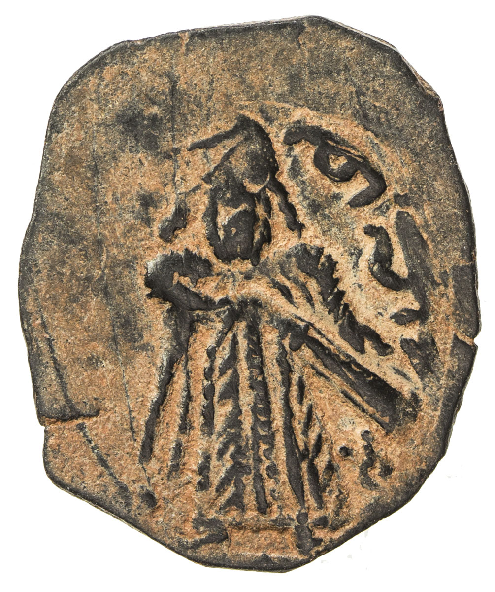 Islamic - Early Pre-Reform,ARAB-BYZANTINE: Standing Caliph, ca. 692-697, AE fals (2.98g), Maarrat Masrin, ND, A-3534.2, without the name of the caliph, pleasing patination, bold VF, R.